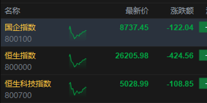 3月2日消息,港股三大指数集体下跌。截至午间收盘,恒生指数跌1.59%,报26205.98点,恒生科技指数跌2.12%,国企指数跌1.38%。盘面上,科网股集体下跌,小米跌超4%,百度、阿里巴巴、美团、京东、快手、联想跌超2%;油气设备与服务股大涨,山东墨龙涨超66%;航空股普跌,南方航空跌超8%;影视股持续走低,大麦娱乐跌超7%。