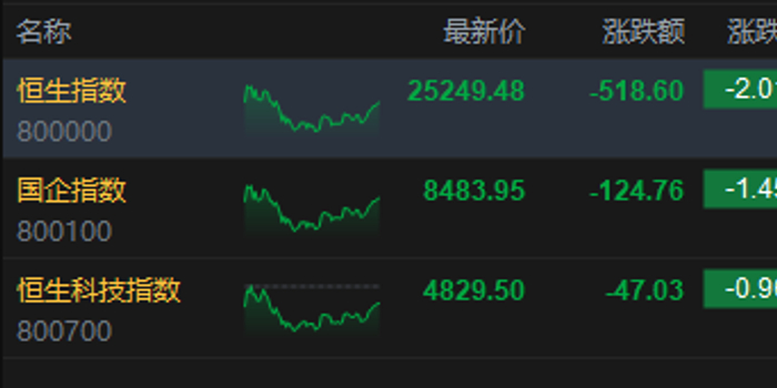 3月4日消息,港股三大指数集体下跌。截至收盘,恒生指数跌2.01%,报25249.48点,恒生科技指数跌0.96%,国企指数跌1.45%。盘面上,科网股普跌,阿里巴巴跌超3%,京东跌超2%,哔哩哔哩、百度、快手、联想跌超1%;油气设备与服务股回调,百勤油服跌超35%;航运及港口板块下挫,中远海发跌超13%;航空股继续走弱,东方航空跌超6%。