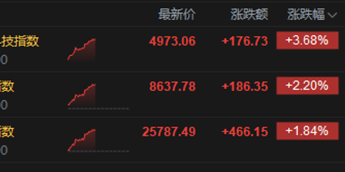 3月6日消息,港股三大指数高开高走。截至午间收盘,恒生指数涨1.84%,报25787.49点,恒生科技指数涨3.68%,国企指数涨2.2%。盘面上,科网股普涨,京东涨超8%,小米、网易涨超5%,阿里巴巴涨超4%;创新药概念普涨,三生制药涨超10%;AI应用股强势,美图涨超6%;“京东系”个股绩后全线走高,京东集团涨超8%。