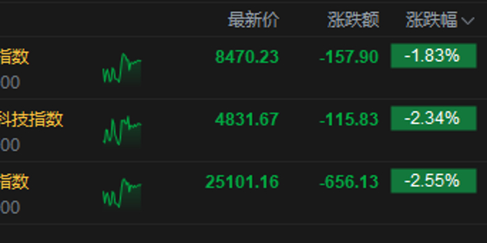 3月9日消息,港股三大指数集体下跌。截至午间收盘,恒生指数跌2.55%,报25101.16点,恒生科技指数跌2.34%,国企指数跌1.83%。盘面上,科网股普跌,哔哩哔哩、网易、百度跌超4%,阿里巴巴、快手跌超3%,京东、联想跌超2%;油气股逆势上涨,山东墨龙涨超49%;航空股下挫,中国国航跌超7%;今日三只新股上市。