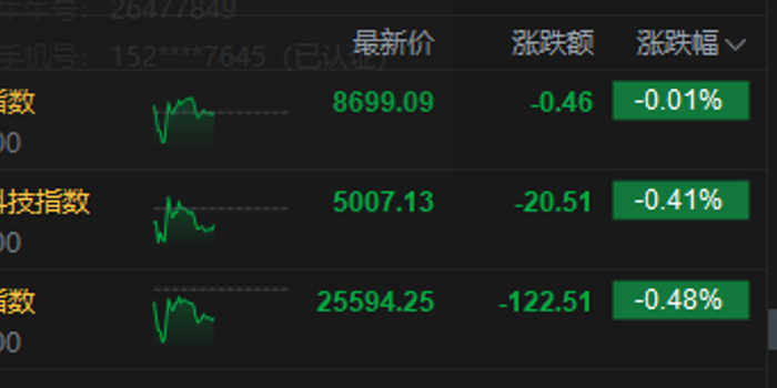 3月13日消息,港股三大指数集体下跌。截至午间收盘,恒生指数跌0.48%,报25594.25点,恒生科技指数跌0.41%,国企指数跌0.01%。盘面上,科网股涨多跌少,阿里巴巴、网易、京东、百度、腾讯涨超1%,联想跌超1%;化肥板块逆势上涨,中化化肥盘中创阶段新高;航空股普跌,国泰航空跌3%;黄金股跌幅居前,珠峰黄金跌超5%。