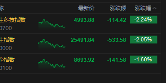 3月19日消息,港股三大指数集体下跌。截至收盘,恒生指数跌2.05%,报25491.84点,恒生科技指数跌2.24%,国企指数跌1.6%。盘面上,科网股跌多涨少,腾讯、快手跌超6%,哔哩哔哩跌超5%,阿里巴巴跌超4%;黄金股普跌,灵宝黄金跌超14%;AI应用股回调,Minimax跌超13%;岚图汽车上市首日跌13%。