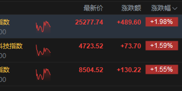 4月1日消息,港股三大指数集体上涨。截至午间收盘,恒生指数涨1.98%,报25277.74点,恒生科技指数涨1.59%,国企指数涨1.55%。盘面上,科网股涨多跌少,哔哩哔哩涨超5%,网易、百度涨超3%,阿里巴巴、腾讯、联想、快手涨超2%,美团跌超2%;创新药概念股大涨,荣昌生物涨超13%;航空股回暖,东方航空涨超6%;黄金股普涨,潼关黄金涨超10%。