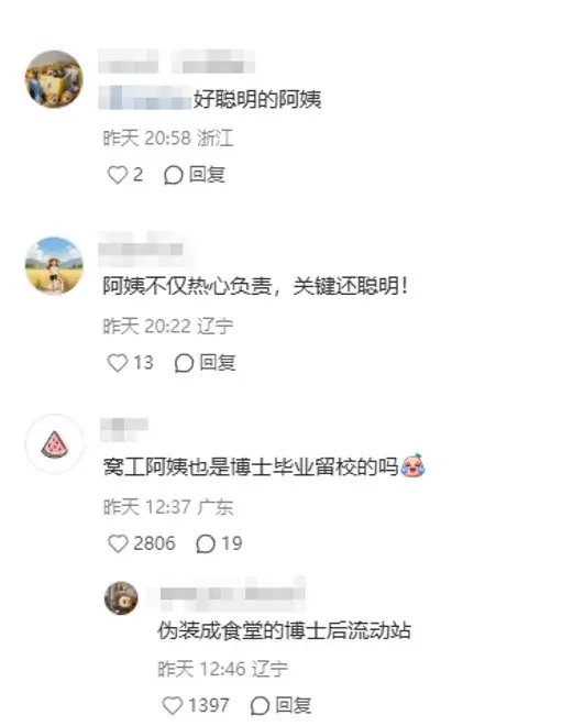 故事的主人公,正是大工博留食堂的杨阿姨。网友们戏称出此妙招的杨阿姨是“博士毕业”——虽然杨阿姨不是博士毕业,但杨阿姨的一个女儿已经从北大博士毕业,另一个女儿正在大工攻读博士学位。