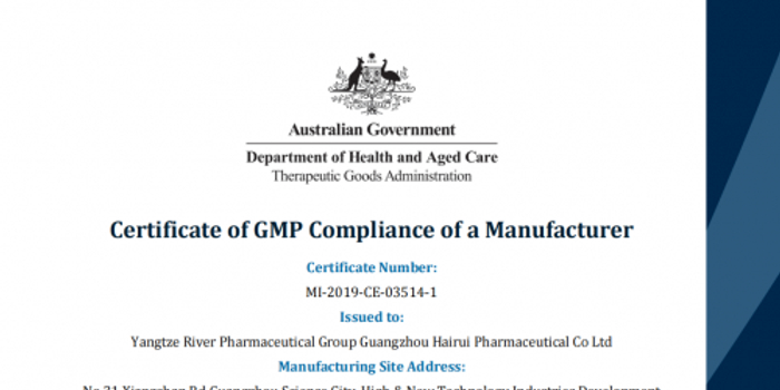 扬子江药业集团:广州海瑞药业车间通过澳大利亚TGA GMP认证