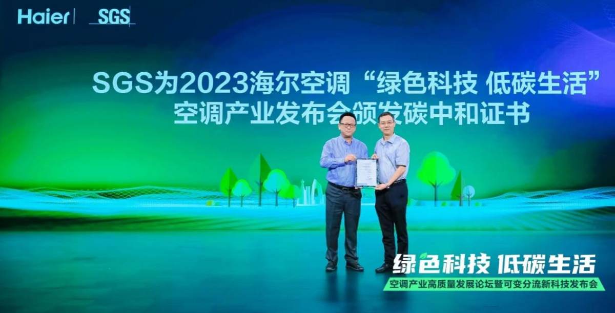会上,SGS中国区副总裁辛斌为海尔空调颁发《碳中和证书》,以表彰海尔空调在节能减排科技产品的研发和绿色节能上的努力,肯定了企业积极承担社会责任的担当精神。同时,中华环保联合会副秘书长李瑞东为海尔空调颁发了《2023年度环保公益战略合作伙伴证书》,并联合发起环保倡议,共同推动绿色低碳发展。