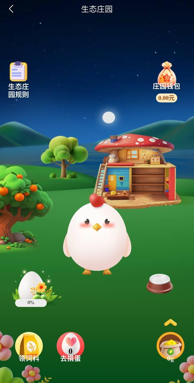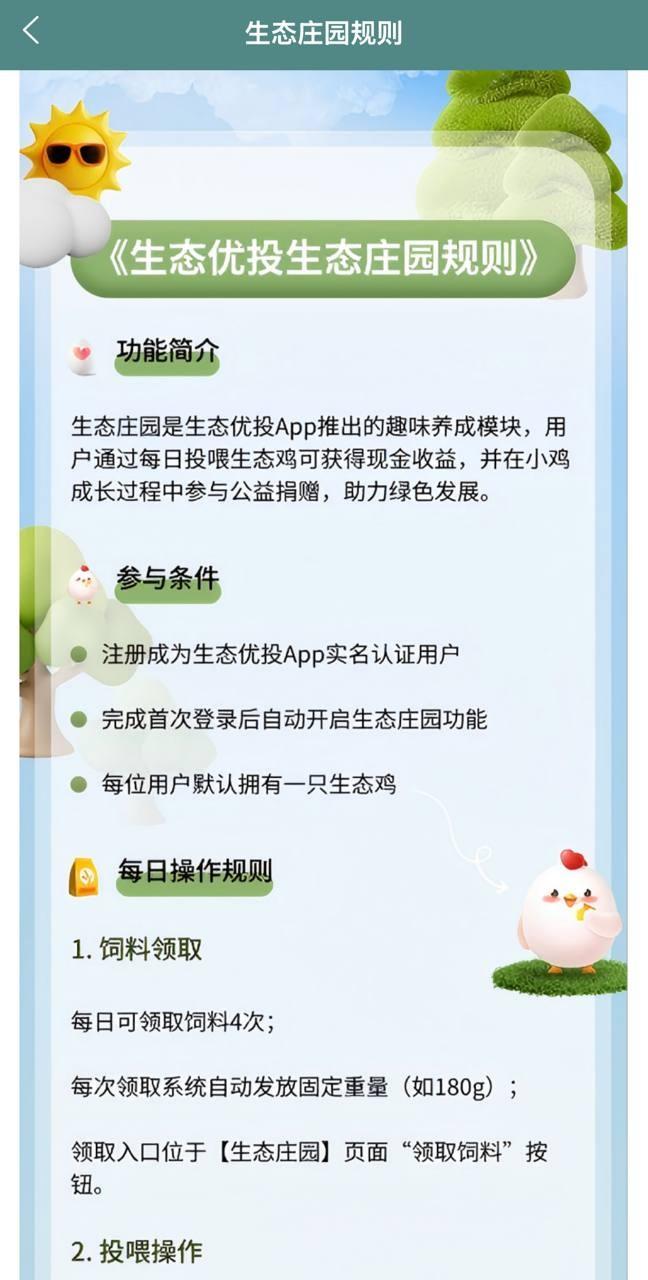 在参与绿色项目的同时,平台还上线了寓教于乐的“生态庄园”公益互动模块。该功能通过“饲养公益小鸡、投喂获取现金、产蛋捐赠公益”的方式,将绿色理念与志愿行为有机结合。用户每日可在生态庄园内领取饲料或节日纪念品(如粽子,蛋糕),投喂后获得现金奖励,并通过产蛋捐赠支持绿色公益项目。