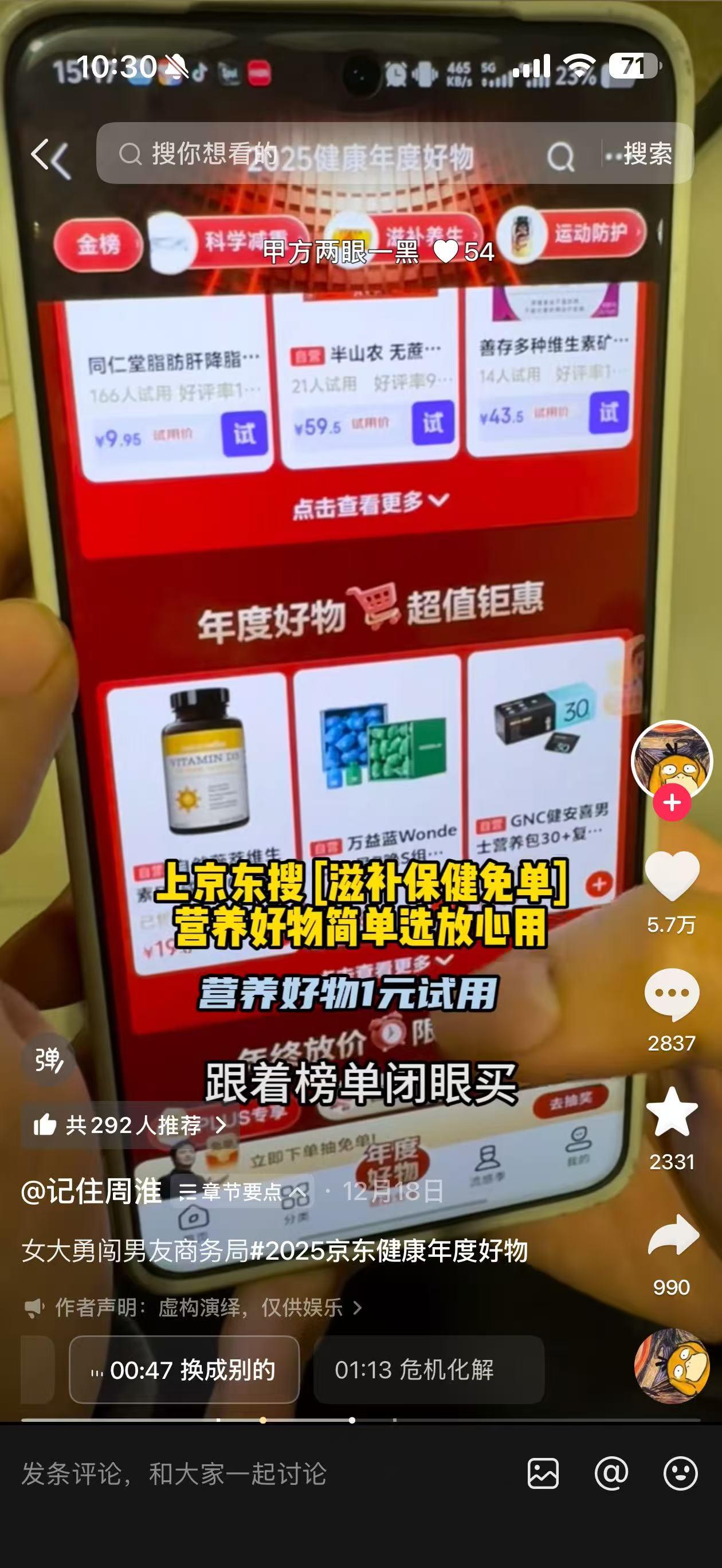 在此背景下,京东健康以高关注IP打开认知入口,用系列内容延续声量,并通过多元生活场景承接用户真实需求,让“健康金榜降低选择成本” “问营养师提供专业判断支撑”等平台价值清晰传递,推动健康消费从“凭经验试错”转向“有依据可参考”,透传平台科学营养补充、专业守护健康的价值主张和能力。