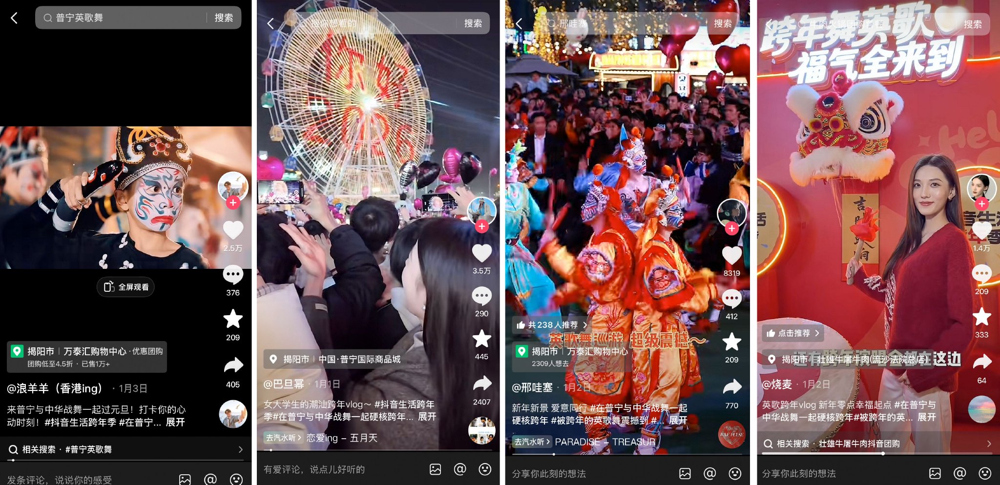 在线上内容持续升温的基础上,抖音生活服务联动广东文旅共同将活动热度延伸至线下。12月31日,在揭阳普宁落地了一场集非遗体验、潮流狂欢、美食消费于一体的线下跨年活动,既为市民游客带来了沉浸式的体验,也有效激活了当地文旅消费新动能。