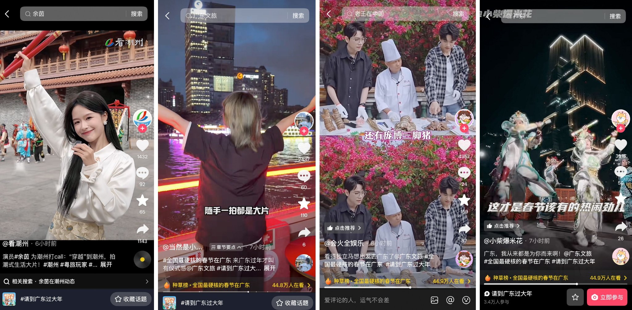 大量市民游客在真实出行与消费体验中加入话题讨论,分享“我在广东过大年”的亲历视角。多元内容自然汇聚到#请到广东过大年 话题池中,形成从明星示范、达人拆解到用户复刻的完整内容链路,用户可从中获取更多明星同款路线,完成从“刷到-心动-搜索-体验”的无缝衔接。