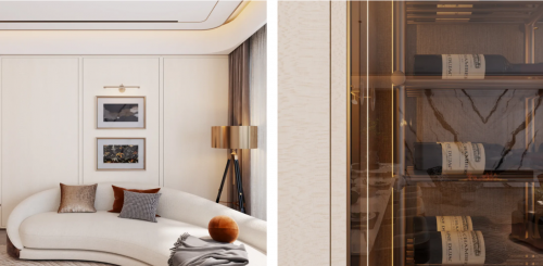 客厅门墙柜:搭配绒布沙发、金属装置、艺术画等,轻奢感瞬间撑起“松弛感居家氛围”,是主流家庭的首选;