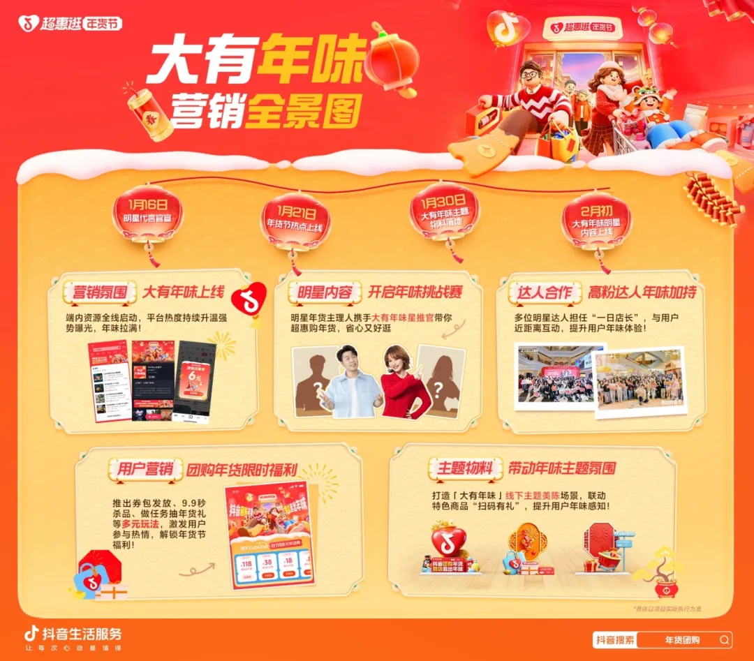 抖音生活服务将持续释放年货优惠,上抖音搜索“超惠逛年货节”,一键领取心动福利,轻松团购品质年货,到店逛出大有年味!