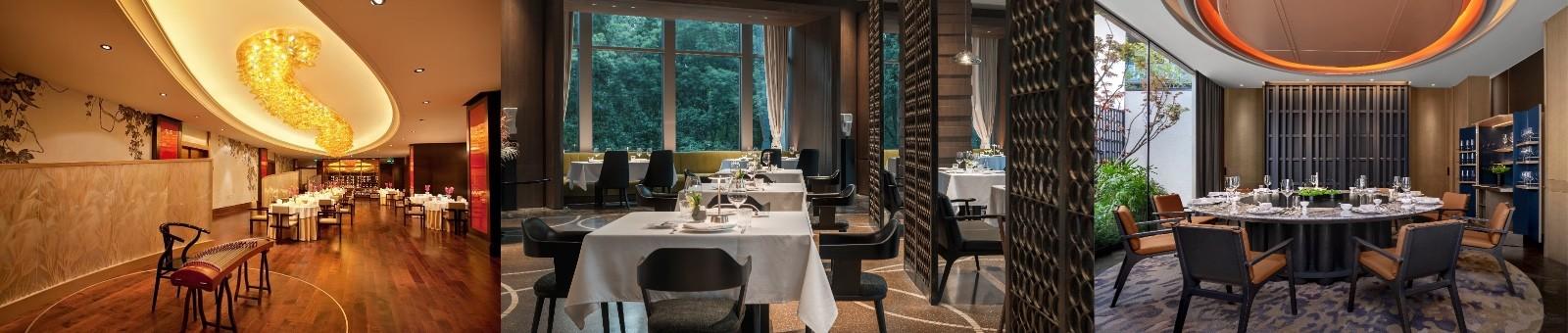从左至右依次为:无锡君来洲际酒店吴粤一号中餐厅、苏州洲际酒店里瓦地中海扒房、苏州金普顿竹辉酒店竹趣轩