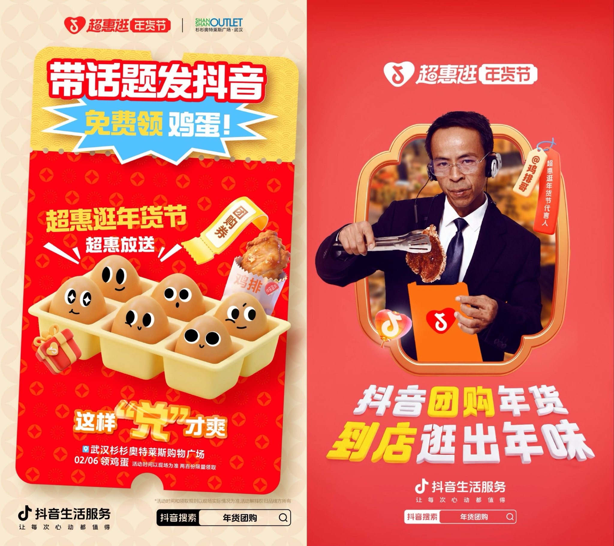 新年的第一口鸡排,由‘超惠逛年货节’请大家免费吃!活动特邀达人@景德镇(鸡排哥)于2月6日空降武汉杉杉奥特莱斯营业,现场带话题发布活动视频,并关注武汉杉杉奥特莱斯抖音账号就有机会免费吃到鸡排啦(全场限量450份)。除此之外,还能免费领鸡蛋,以及可爱又实用的活动限定周边哦,数量有限,先到的人先享受“连吃带拿”!