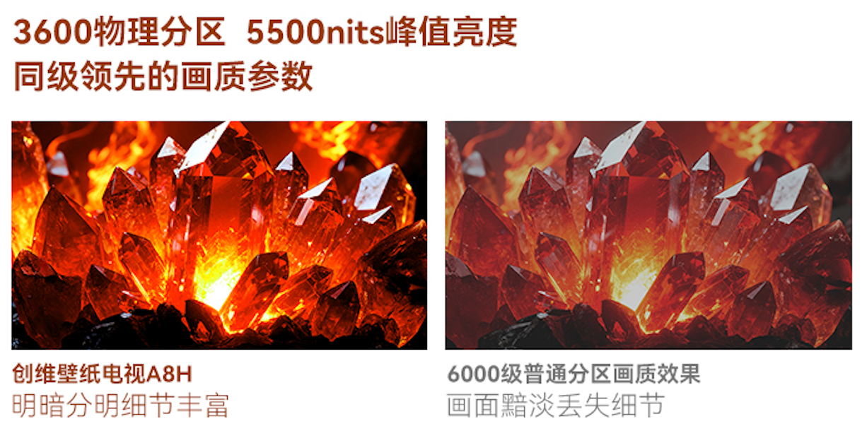 色彩真实是对高画质的要求之一,另一个同等重要的,则是光影真实。为了进一步提升画质,创维壁纸电视A8H配备了同级领先的3600个物理背光分区,可以单独控制不同区域的亮度高低,而不是像无分区背光一样统一调节,明暗细节都清晰可见,光影层次更加立体分明。