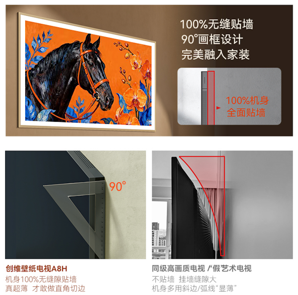 “薄”是壁纸电视的核心诉求之一,“薄如画”则是创维对壁纸电视独特的美学理解。创维壁纸电视A8H的厚度仅有3.9cm,超薄机身让其无需再像普通电视一样斜切显薄,直接用90°全直角切边勾勒出机身轮廓,以利落形态诠释对画框概念的极致追求,更可以100%无缝贴墙安装,任意角度看去都犹如真实画框般赏心悦目。