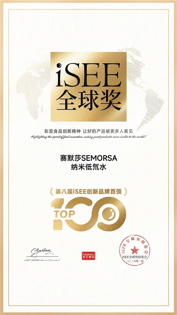 据悉,第八届iSEE全球奖现已全面进入复审阶段,终极大奖结果将于2026年4月在无锡举行的年度盛典上隆重揭晓。赛默莎方面表示,此次入选全球百强是对品牌创新路径的肯定,未来将继续深耕低氘水领域,以更极致的科技守护更多人的健康。