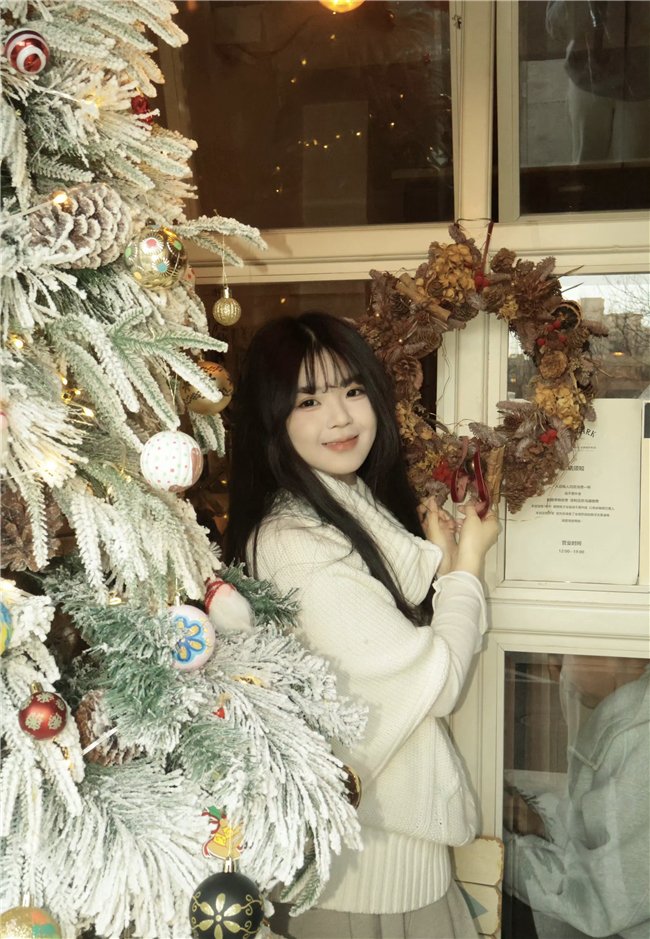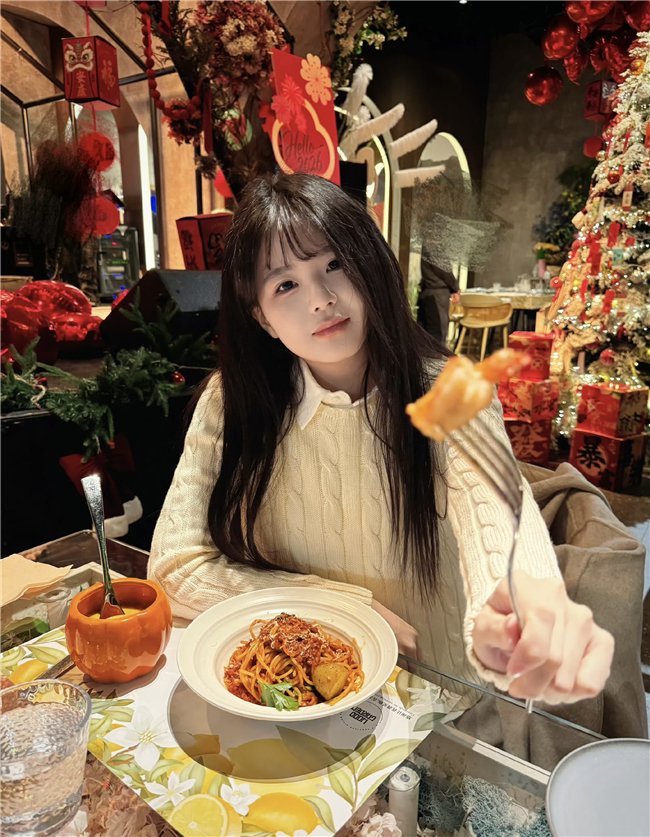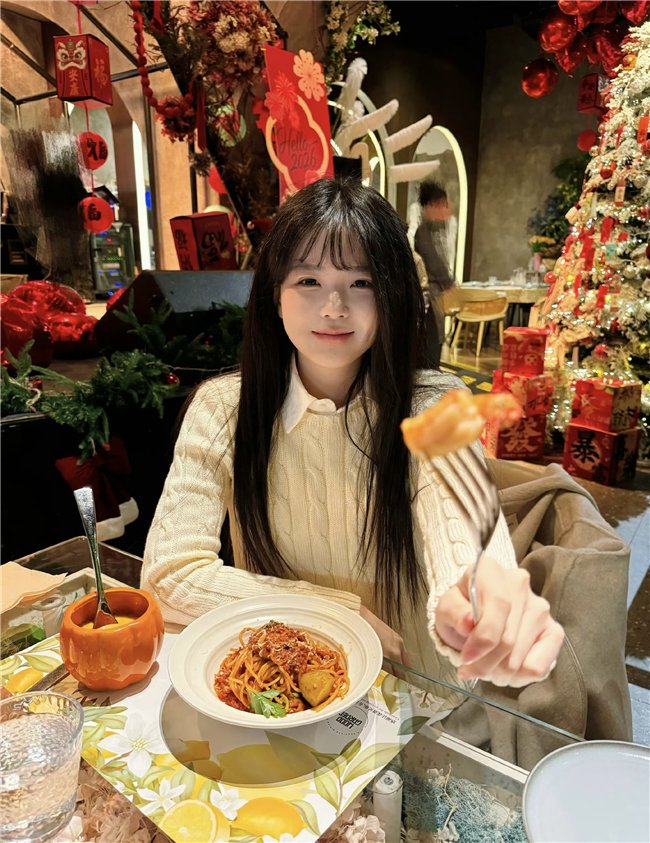 镜头里的场景氛围感拉满,餐厅内挂满红灯笼与新春装饰,一旁的圣诞树还未撤下,红金配色的年味与暖黄灯光交织,衬得画面格外温馨。林宥恩身着米白色绞花毛衣,内搭简约白衬衫,长发柔顺垂落,空气刘海衬得脸庞愈发小巧。她手中举着叉子,叉上的美食近在镜头前,仿佛在与屏幕前的网友分享这份美味。