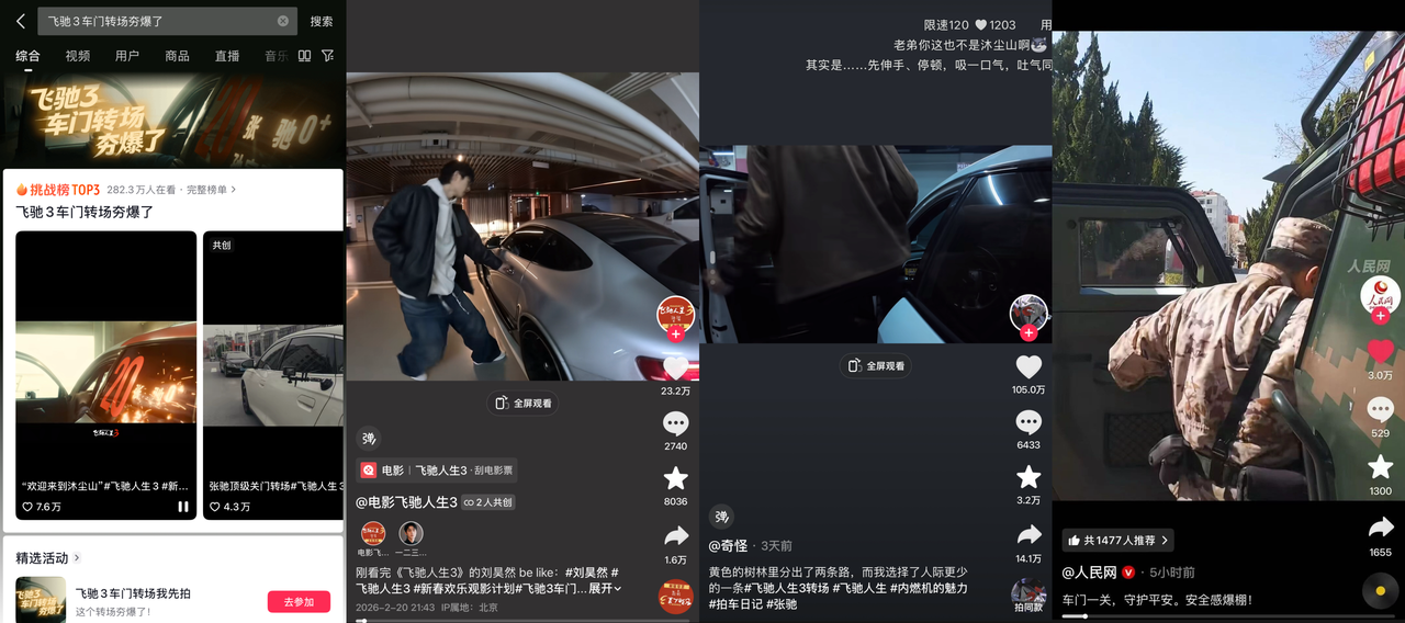 《飞驰人生3》的高燃车门转场更是被玩出新高度,不仅吸引了大批运动爱好者接力挑战,就连蓝V账号纷纷响应,网友抽象二创层出不穷,从全民翻拍到花式整活,话题#飞驰3车门转场夯爆了 播放量超1.4亿,吸引了万人参与活动。