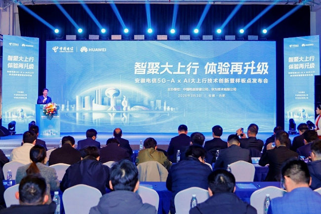 3月3日,MWC26 巴塞罗那期间,华为与中国电信在安徽合肥举办“5G-A×AI 大上行技术创新暨样板点发布会”,展示超级上行、灵活帧结构、载波聚合等前沿技术成果。现场体验区的机器人导览、智能跟拍直播、AI 眼镜翻译等应用,直观呈现 5G-A 与 AI 融合推动网络从“以下行为主”向“上下行并重”演进的新趋势。