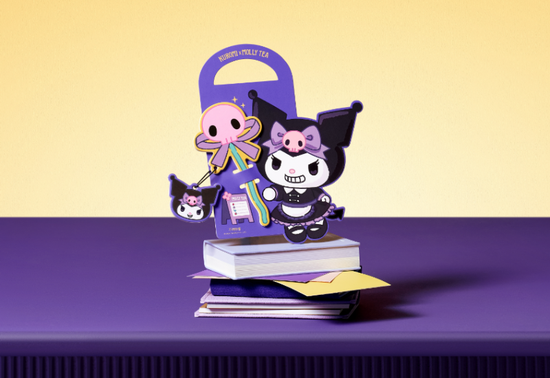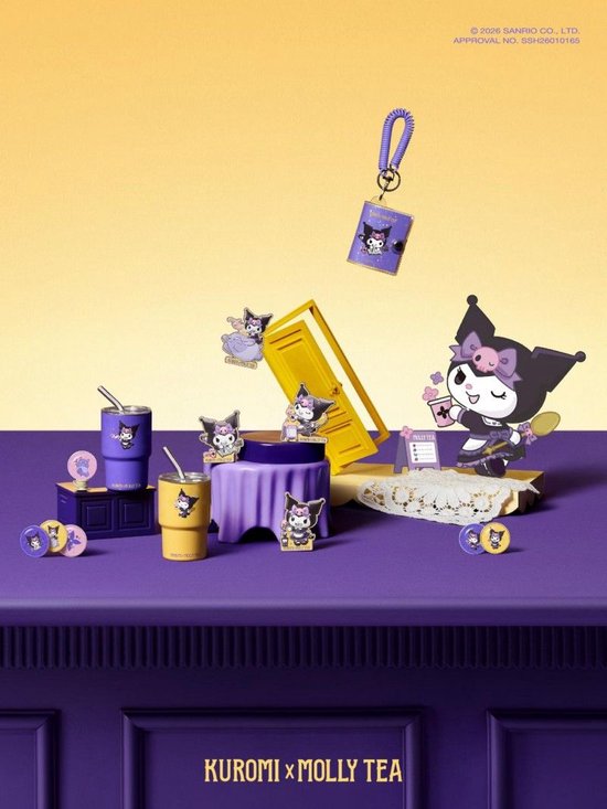 本次联名主视觉采用黄紫大胆撞色,以“暗黑奶茶店”为场景呈现酷洛米在店中制造各种“使坏”的宫格小剧场——例如做“黑暗特调”、在小本本上吐槽等,以幽默且富有个性的方式,展现酷洛米“坏”却坦诚可爱的一面。