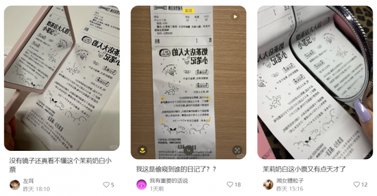 本次联名,在小票营销创意上一直不让消费者失望的茉莉奶白又创新了玩法。从3月3日开始,随杯小票上每日更新以“反转镜像文字+奶茶店大人的笔记连载”的创意内容,一反一正,既呈现令人眼前一亮的“反转”叙事,也让“反正由我”增加了物理玩法。在社媒上,网友被酷洛米“反转”小票激发出各种灵感,有拿镜子阅读的,也有透光解密的,酷洛米隐藏的心情被开发出千种读法。