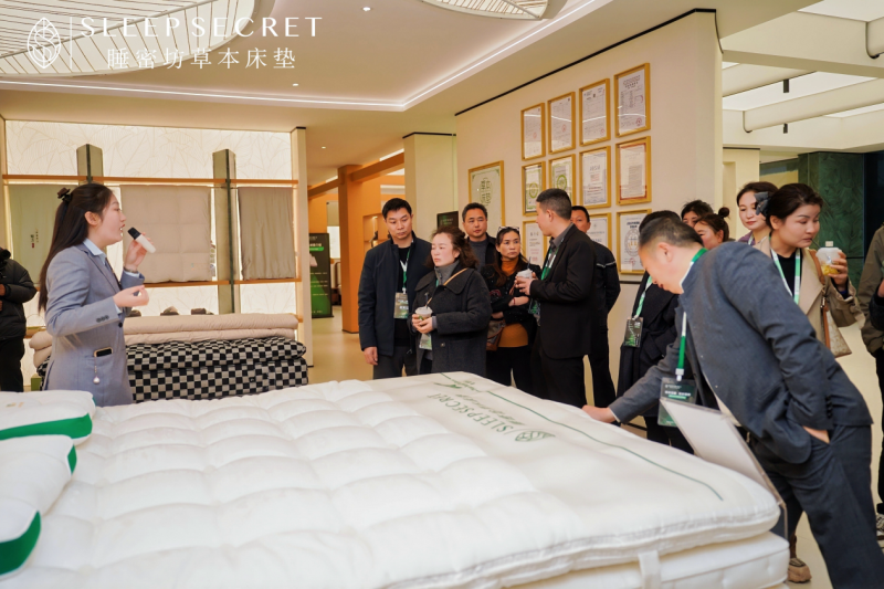 当天下午,与会嘉宾、经销商伙伴及媒体代表共同前往睡密坊展厅进行实地参观考察。展厅内集中陈列了本次重磅推出的助眠、护脊除臭、记忆三大系列全品类草本床垫新品,各型号产品按系列分区有序展示,让在场嘉宾更直观地感受到睡密坊在草本健康睡眠领域的技术积淀与产品实力,也进一步增强了经销商伙伴与品牌携手发展的信心与决心。