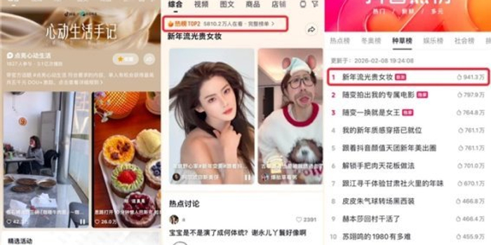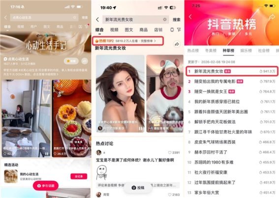 活动期间,核心话题 #点亮心动生活 播放量突破 3.1亿,吸引了超过千位创作者参与。其中,与美妆品牌 NARS 共创的 #新年流光贵女妆 话题,更是登上了抖音热榜总榜TOP2、种草榜 TOP1,成为这个新年最具讨论度的美妆趋势之一。