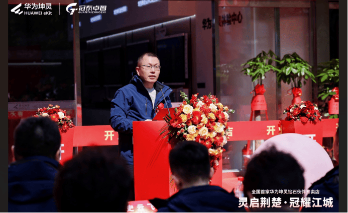 武汉冠泰卓智科技有限公司总经理龚威发表致辞,他表示,华为坤灵钻石伙伴专卖店是华为分销业务的突破性尝试,也是服务中小企业智能化跃升的全新商业模式。作为湖北钻石分销商,公司将以专卖店为作战阵地,落地营、销、服一体化市场策略,全方位助力湖北集成商、工程商发展。未来 2 年,公司计划将华为坤灵钻石伙伴专卖店拓展至湖北各个地级市,在地市打造作战阵地、发展同路人,助力合作伙伴提升营收规模与服务能力,打通中小企业通往数智化世界的最后一公里。
