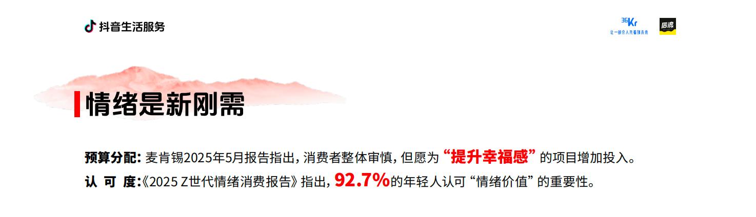 在这样的背景下,抖音生活服务与36氪及后浪研究所联合发布了《2025年度生活服务商家趋势报告》(以下简称《报告》)。《报告》将这种变化概括为“心价比”进入消费决策核心——当价格不再构成绝对优势,消费者开始为确定性的体验、可兑现的情绪价值买单。