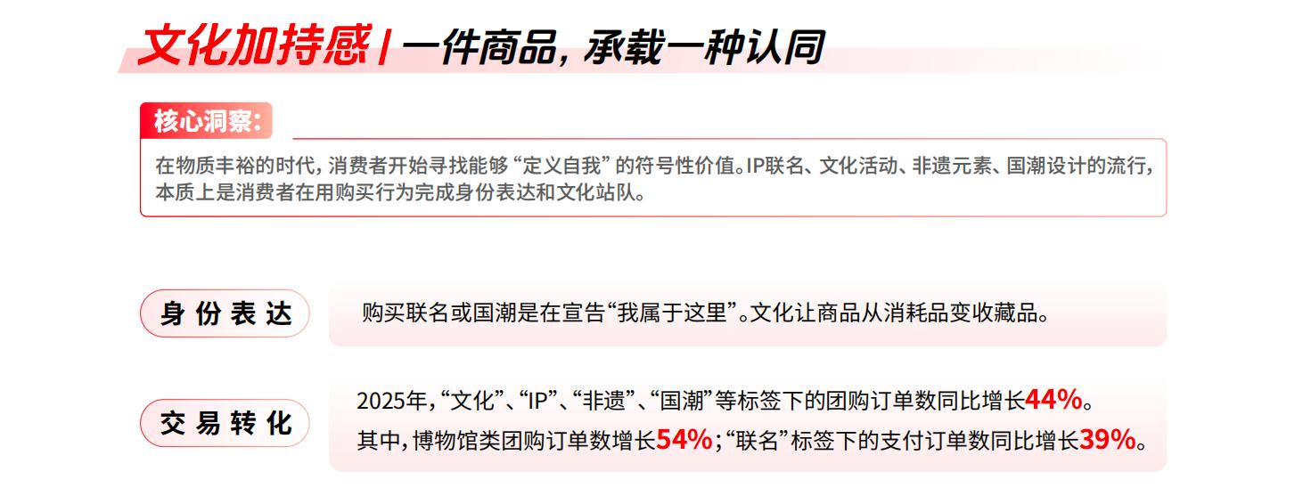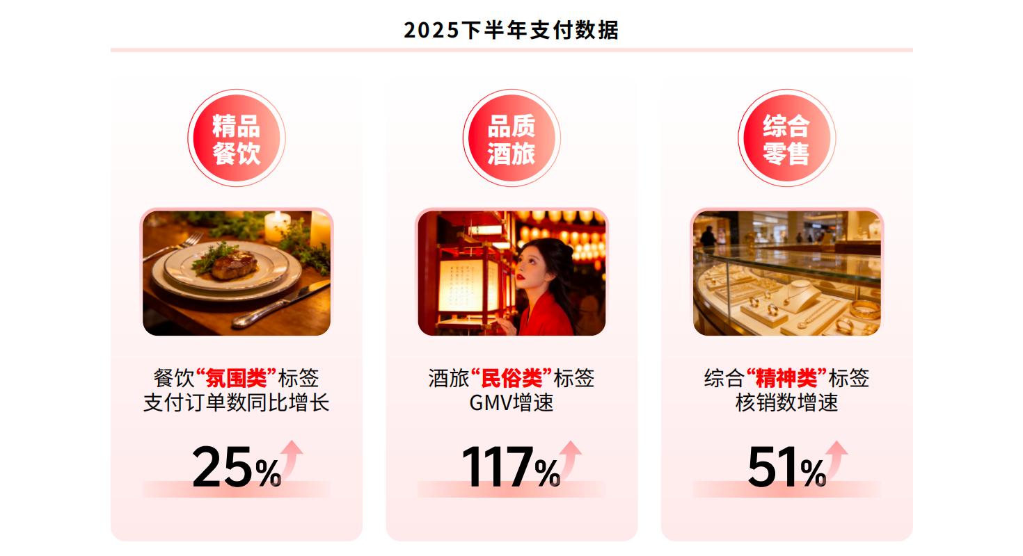 而支付端的实际呈现,让趋势从宏观走向具体。在各类线下生意中,为体验而支付更高溢价的现象正在扩大。餐饮领域,200元以上的高端团购套餐持续走高;酒旅赛道,千元以上的体验型产品保持活跃;零售和服务行业中,带有文化与身份标签的商品交易活跃度提升。