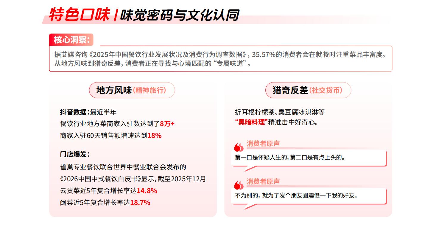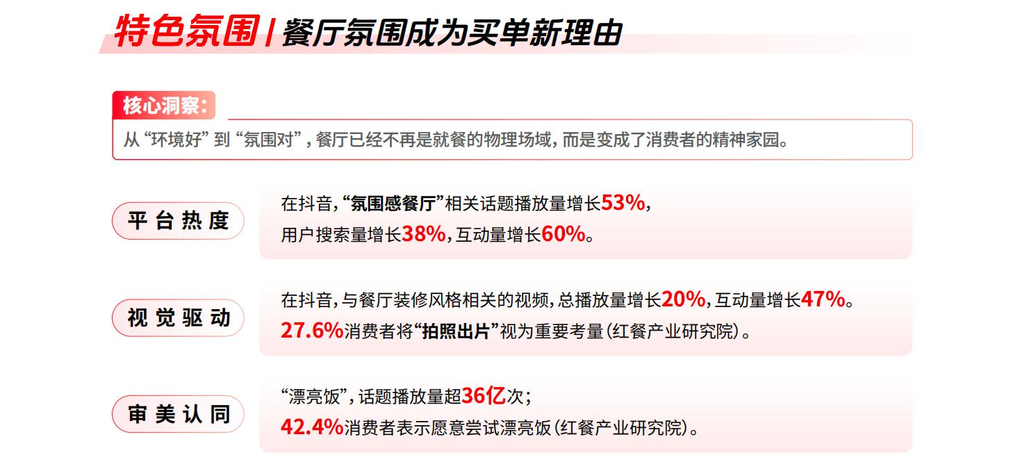 报告中关于餐饮的拆解显示,特色氛围、特色情绪和特色口味正在形成合力。一方面,“氛围感餐厅”“漂亮饭”等内容在平台上的热度持续攀升;另一方面,一人食、烟火气、怀旧风味等看似分散的偏好,其实都指向同一个底层需求:在吃饭这件高频日常中,重新找到情绪的落点。