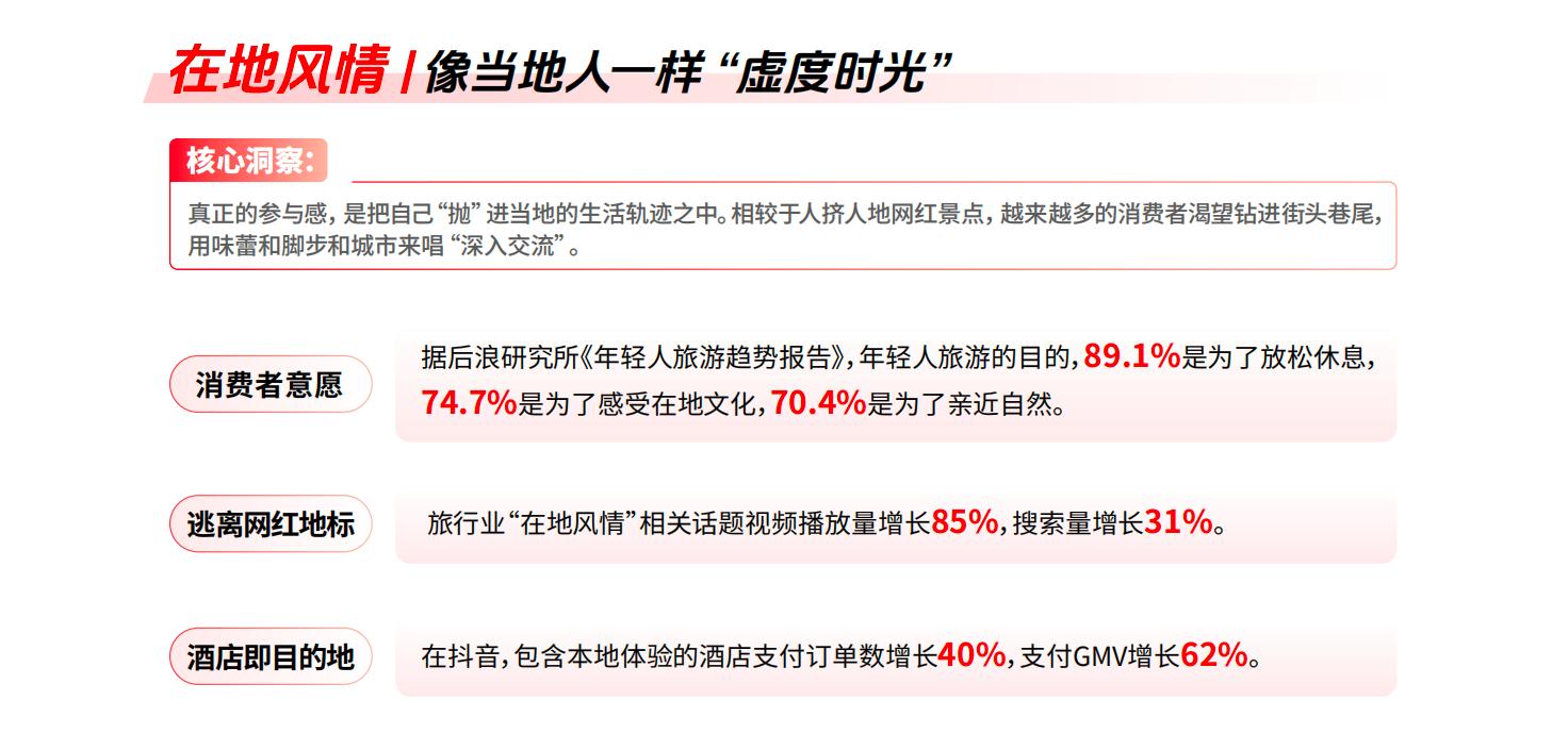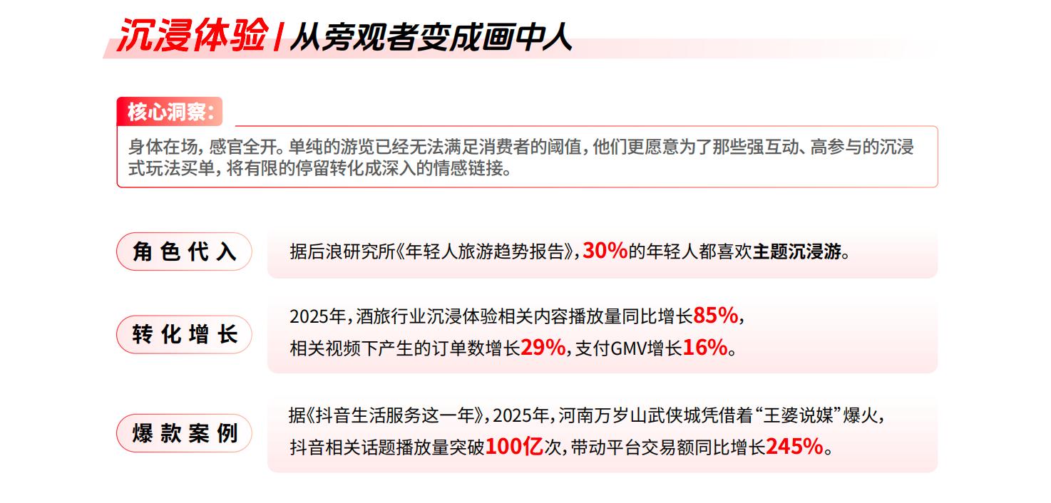 报告中提到,“参与感”相关内容的播放、搜索与互动显著增长。用户开始为“我能在这趟旅行中体验什么”买单,而不仅仅是“我能看到什么”。这种转变也让酒旅消费从一次性服务,逐渐向情绪记忆和重复体验延伸。