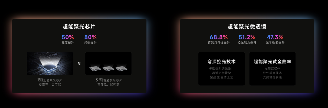 但是,小OD聚光后会使光线无法均匀混合,导致出现颗粒感。为解决这一问题,创维A10H Pro采用了「超能聚光灯珠」,每个灯珠上都有一个形似倒扣碗状的微透镜,中间的凹陷部分会将光线在合适的范围内再次扩散,与相邻灯珠均匀混合,很好地兼顾了高亮度和光线均匀性。此外,「超能聚光灯珠」的每个灯珠内都有数个微小的发光晶体,支持高压小电流LED芯片驱动,大幅降低大电流驱动时的能量损耗,能够在相同功耗下输出更高亮度,使创维A10H Pro相较同级产品,光效提升80%、亮度提升50%。