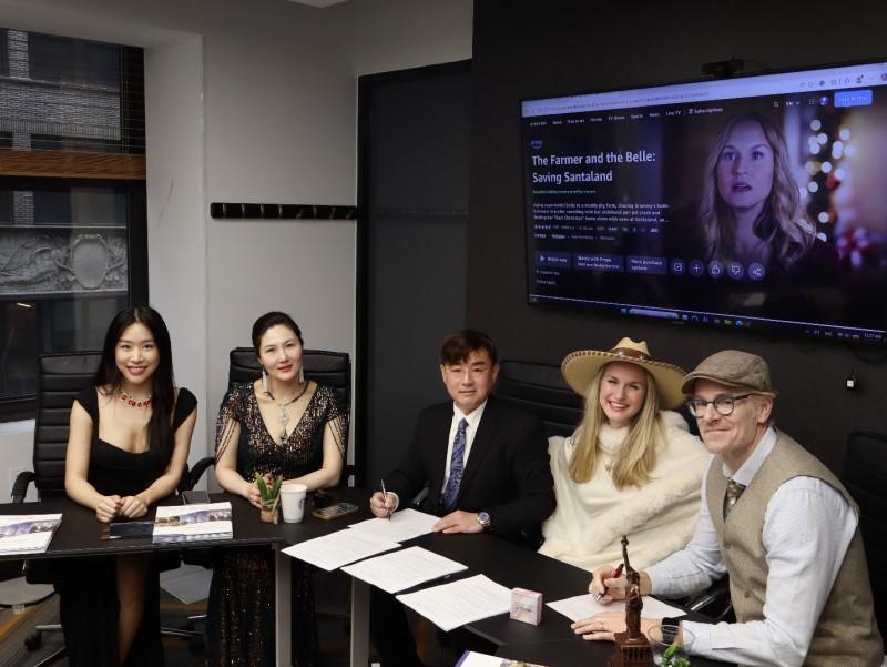 纽约尊传媒总裁Raymond Chen携所推荐的两位影片华语市场形象大使兼演员Claire Wu、Teresa Yolanda Cheung,与制片人Jenn Gotzon Chandler、Jim E. Chandler举行签字仪式 (2026年3月6日,曼哈顿)
