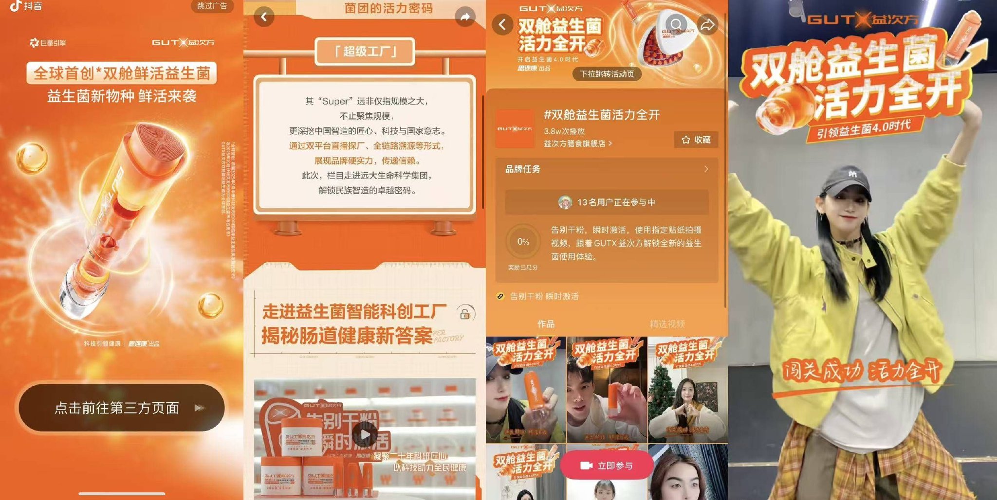 如果说央视网以深入浅出的“探厂内容”、王牌栏目的公信力和“央媒矩阵”来助力品牌,抖音则作为本次直播的承载平台,为这场溯源之旅提供了全周期的场景与功能支撑。直播前期,平台上线专属互动 H5 为活动预热造势;直播结束后,又通过平台机制完成直播亮点内容的切片分发与精准推荐。此外,强调“互动为王”的抖音凭借自身UGC生态优势,为品牌定制“双舱益生菌活力全开”挑战赛和“活力双舱”专属贴纸,网友只需带话题发布一段趣味手势舞视频,即可参与挑战并有机会赢取奖励。挑战赛门槛不高,能让每个参与其中的人切身体会“活力全开”的畅快,轻易记住那支橙色的双舱鲜活益生菌。