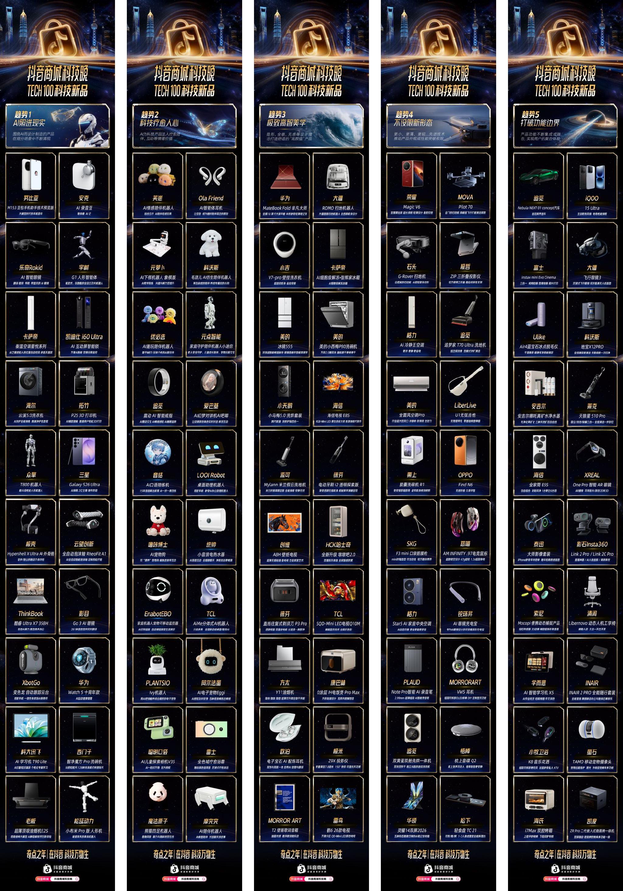 TECH 100 新品的诞生,是基于抖音商城平台用户对相关产品的搜索、种草内容的播放量、生意爆发等三大维度,从海量科技与耐消商品中遴选出来;并在此基础上,结合用户关注度、内容热度与讨论度及购买行为,总结出2026年五大科技趋势。