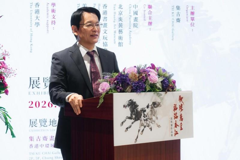 中国画院理事长乔雨先生在开幕式致辞中表示,三月香江艺术盛宴纷呈,中国画院联合主办此次展览,既是对香港艺术的致敬,也是中国水墨的一次精彩亮相。他介绍,马欣乐师从黄胄,深得长安画派精髓,又融汇中西,其笔下的马形态万千、气势磅礴,被誉为“徐悲鸿之后画马第一人”。其代表作《神驰九骏图》曾作为国礼赠予英女王,《驰骋风雪图》被美国克林顿总统收藏。乔雨先生指出,香港是中华文化通向世界的重要桥梁,相信马欣乐既承古意、又开新境的作品定能引发深刻共鸣。他寄语展览让更多市民和藏家感受中国水墨的创新活力,并祝愿香港文化繁荣“万马奔腾”。