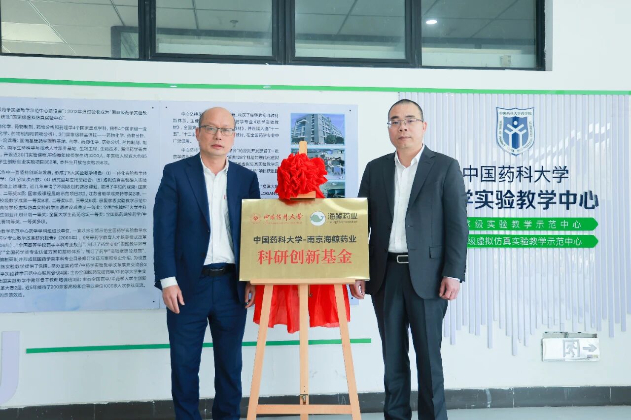 深化合作,共启新篇!中国药科大学药学院狄斌教授与南京海鲸药业营销总裁吴震瑜共同为“中国药科大学-南京海鲸药业科研创新基金”揭牌,携手推动产学研融合迈向新高度。