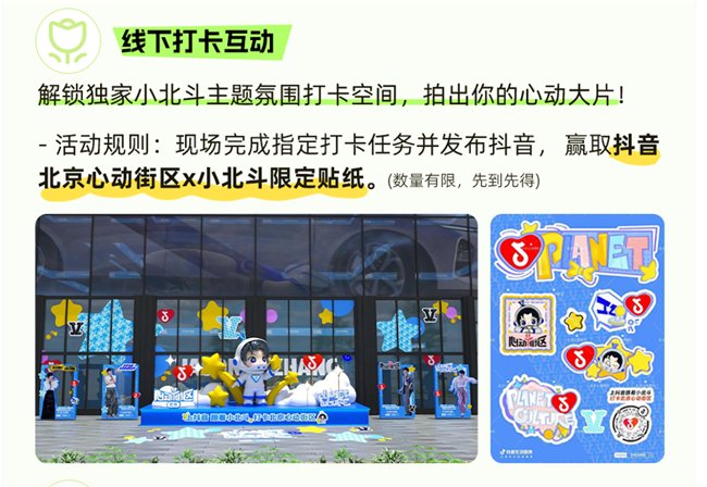 3月20日至4月19日,抖音生活服务「心动街区in北京」携手张杰官方IP形象「小北斗」,在THE BOX朝外年轻力中心落地打造专属主题互动空间。