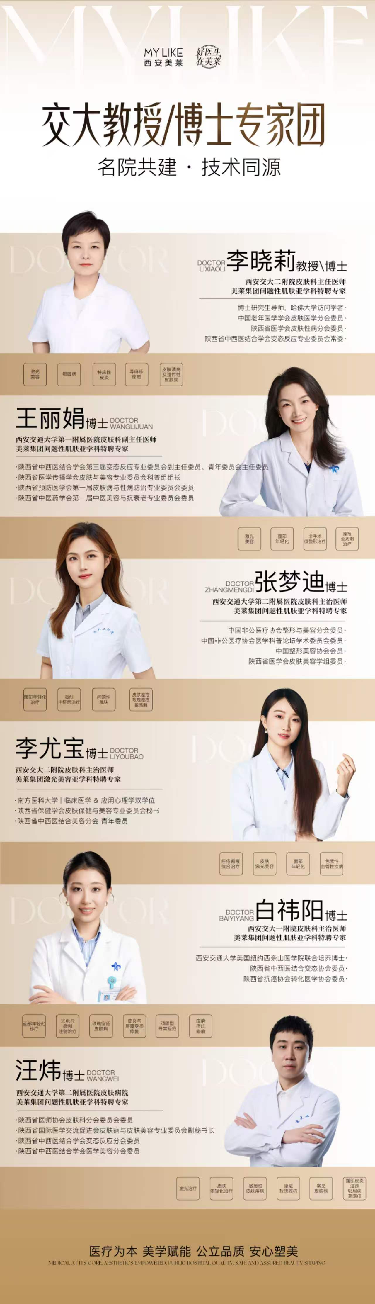 本次专家团由李晓莉、王丽娟、张梦迪、李尤宝、白祎阳、汪炜 6 位交大博士、教授组成,均为西安交大附属医院在职医师,其中李晓莉教授、王丽娟博士分别担任交大二附院、交大一附院皮肤科主任医师、副主任医师,具备数十年临床诊疗经验,在国内皮肤诊疗领域拥有极高的行业认可度。专家团成员覆盖激光美容、面部年轻化、痤疮诊疗、瘢痕修复、敏感肌管理、疑难皮肤病诊疗等全品类皮肤医美需求,能够为求美者提供从皮肤健康诊断到美学抗衰设计的一站式服务。