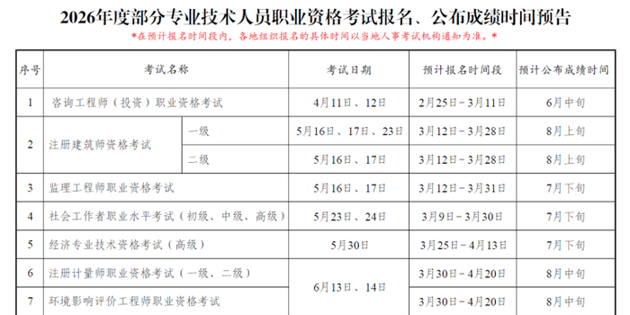 根据通知,2026年度部分专业技术人员职业资格考试的预计报名工作将从2月下旬陆续启动。其中,一级建造师资格考试定于9月12日至13日举行,预计报名时间为6月17日至7月12日,成绩预计在12月中旬公布。一级造价工程师职业资格考试安排在10月17日至18日,预计报名时间为7月24日至8月18日,成绩同样预计在12月中旬公布。中级注册安全工程师职业资格考试时间为10月24日至25日,预计报名时间为8月4日至8月25日,成绩预计在12月下旬公布。