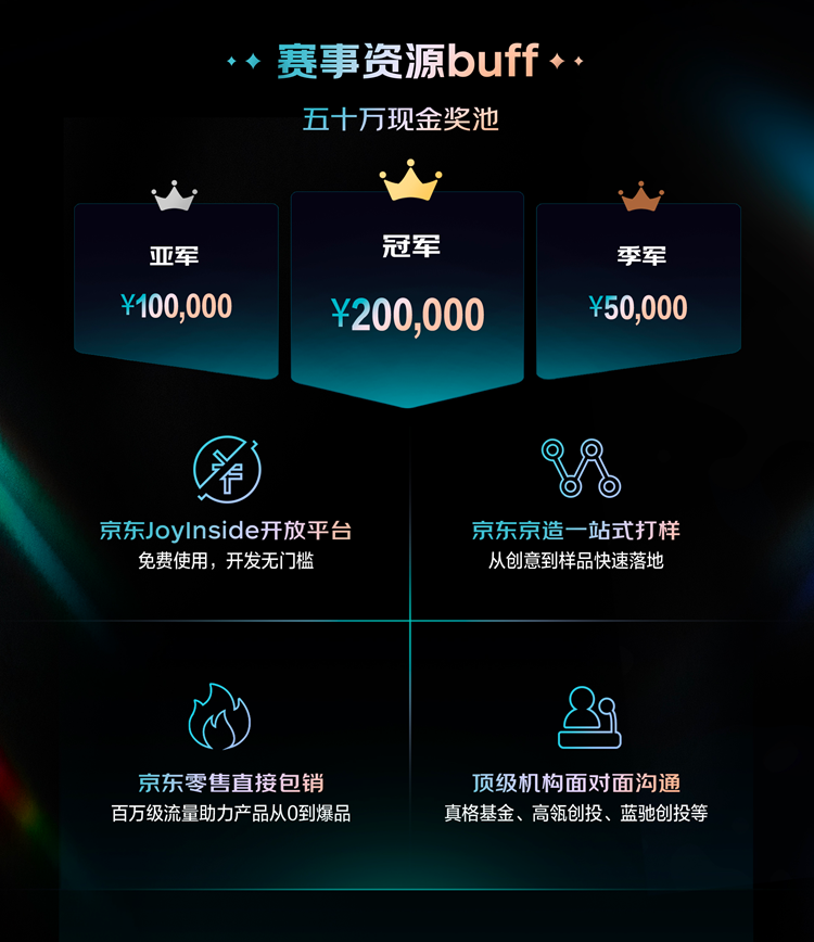 大赛设置50万元现金奖池,其中冠军奖金20万元。决赛优胜团队还将获得真格基金、高瓴创投、蓝驰创投等顶级机构的直通终面机会,学生团队更可直通京东AI团队终面。