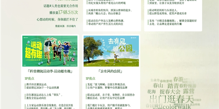 即兴探索:从城市到山野,户外欲望集中释放。「山山而川·春日篇」IP帮户外品牌完成从装备提供者到精神同行者的转身;「童趣走花路·春趣春又来」IP让母婴品牌把山野天地变成产品展示间;而「去有风的公园」IP则为各行业提供了以公园场景、撬动多圈层情绪治愈需求的机会。