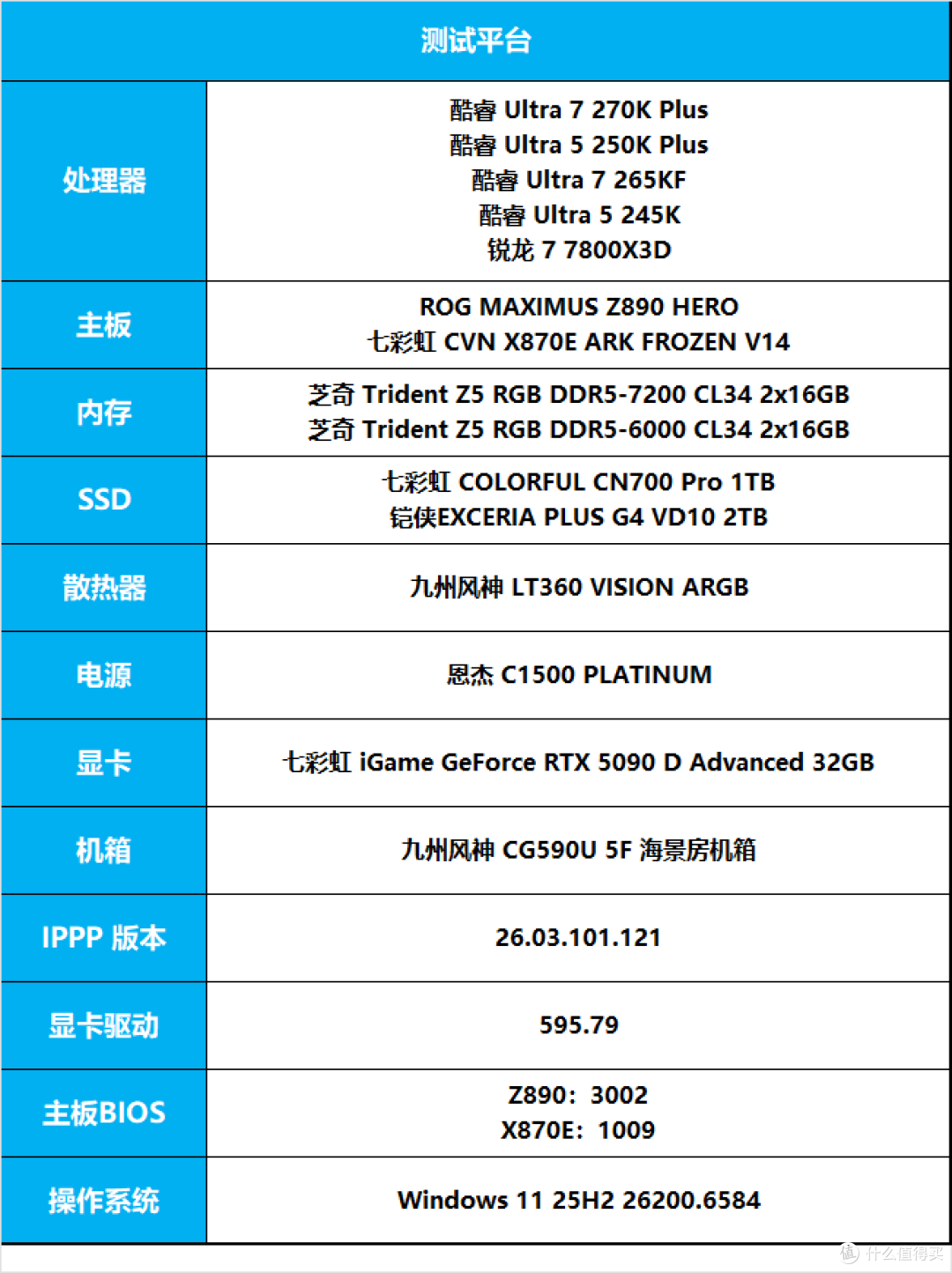 本次测试除了酷睿 Ultra 7 270K Plus、Ultra 5 250K Plus 之外,我们还对上一代 Ultra 7 265KF、Ultra 5 245K 进行了一次新的测试作为对比,同时也对 2000 元价位段非常热门的 AMD 锐龙 7 7800X3D 进行了一轮测试,Intel 处理器测试使用 Intel Default 设置进行,默认打开 APO 功能,AMD 处理器测试开启主板提供的 PBO 选项,并将内存频率调整为 6000MHz,Windows 均为高性能电源模式,不进行任何其它影响性能的操作。