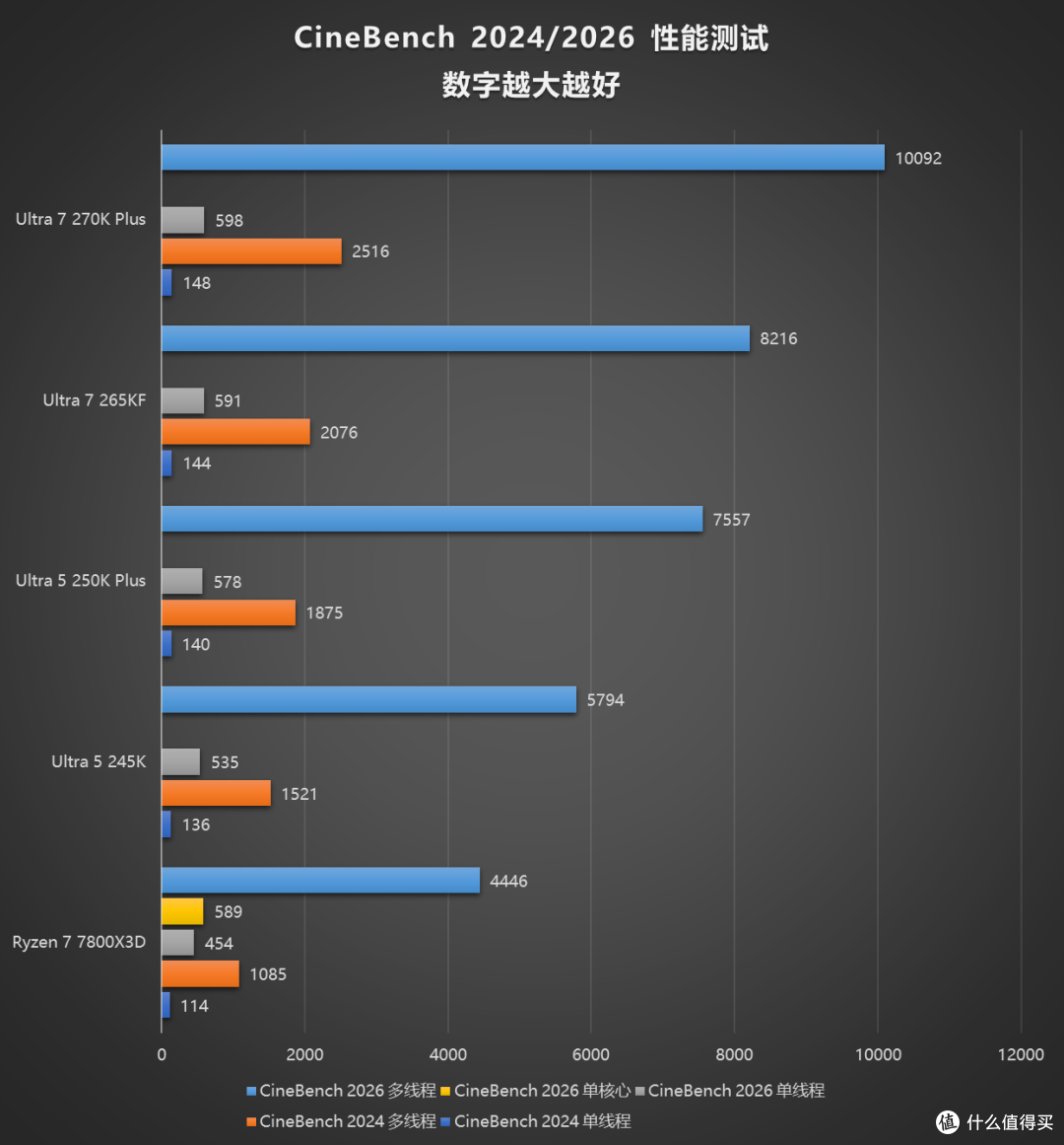 渲染性能的部分 Ultra 7 270K Plus 和 250K Plus 的的表现基本都在预期范围之内,250K Plus 在 Blender 中的表现与 265KF 非常接近。这也是 X3D 处理器中差距最大的部分,大部分项目中的表现甚至不如 245K。这里需要多说一句的是 CineBench 2026 中针对超线程技术开放了新的“单核测试”功能,测试过程中调用一个完整核心而不是一个单独的线程进行测试,将 7800X3D 分数提升了 29.7%,大大提升了它的单核性能排名。