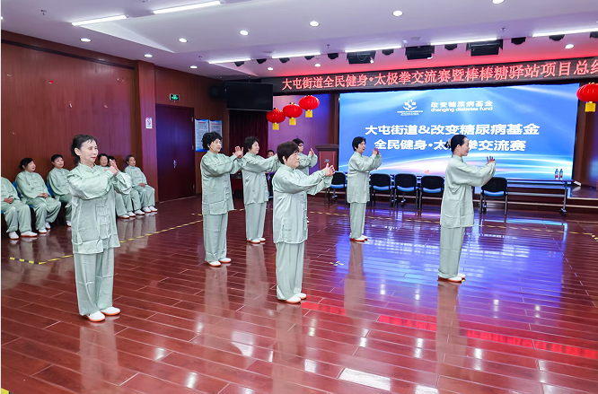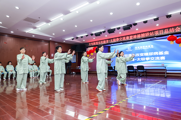 3 月 27 日,由大屯街道与中国医药卫生事业发展基金会改变糖尿病基金联合主办的“大屯街道全民健身·太极拳交流赛暨社区棒棒糖驿站项目总结会”在大屯街道市民活动中心圆满举行。来自辖区的 7 支社区棒棒糖运动队同场交流,践行科学运动理念,以刚柔并济的太极拳法展现健康自信的糖友风貌。