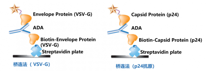 1.采用直接法检测针对慢病毒的广谱ADA:把慢病毒颗粒包被在板底,由于慢病毒本身很难进行标记(主要是因为慢病毒的①结构脆弱性:慢病毒的囊膜对物理化学处理敏感,易失活;②靶点稀少与异质性:表面可用于共价标记的化学基团(如赖氨酸的氨基)数量有限且分布不均;③功能敏感性:标记反应容易损伤其感染性所必需的表面糖蛋白(如VSV-G)),所以用anti-human Fc antibody进行检测,这种方法的优势是能够检测到和慢病毒本身结合的所有抗体ADA,缺点是会产生较多的背景信号,特异性不够好。或者利用抗体提取和酸解原理,采用亲和捕获洗脱法(ACE)来检测针对慢病毒本身的所有抗体ADA。