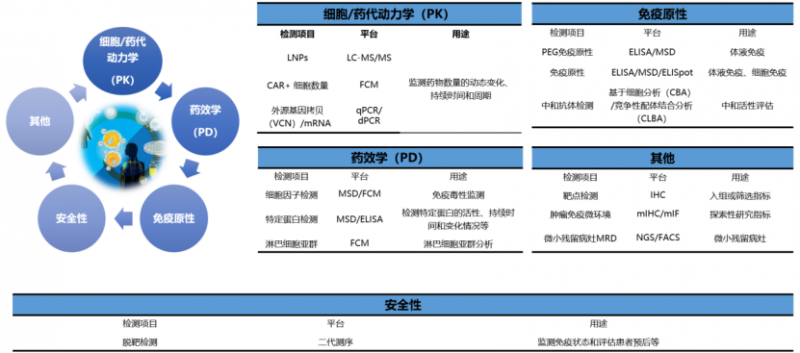 靶向脂质纳米颗粒(tLNPs)的体内细胞治疗,除了进行体外细胞治疗常测的CAR+细胞浓度检测和外源基因拷贝数/mRNA检测以外,如果需要额外关注脂质纳米颗粒在人体内的浓度变化、分布和清除过程,则需要采用LC-MS/MS等技术进行及时检测。脂质纳米颗粒的PK特性与传统药物不同,主要表现为快速组织分布、缓慢消除和肝/肾清除特征。早期临床研究阶段如需要探索相关机制,可以考虑进行全面的药代动力学分析。
