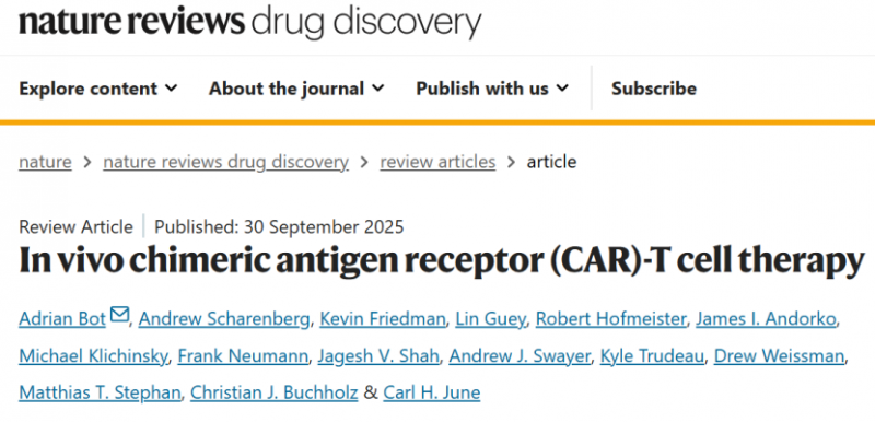 [1] In vivo chimeric antigen receptor (CAR)-T cell therapy, nature reviews drug discovery 2025, https://doi.org/10.1038/s41573-025-01291-5